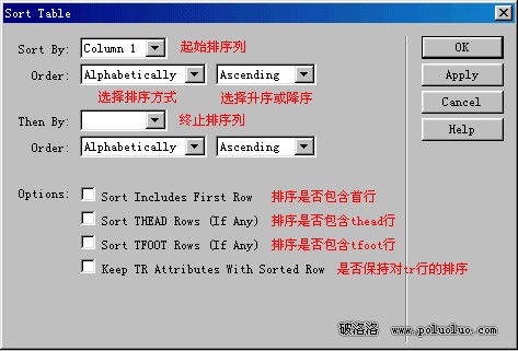 (2)出現sort table窗口,sort by項選擇column 1,order項選擇按字母排序Alphabetically和升序排列Ascending,其它各項各位可參照圖5根據需要進行選擇。