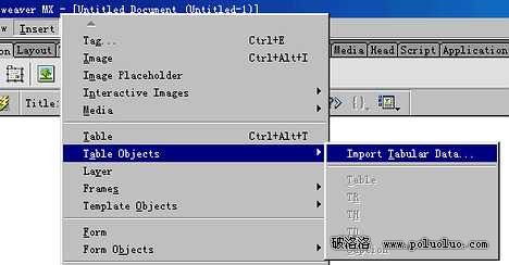 2、(1)打開DW MX,新建一個html頁面,選擇菜單欄insert/table objects/import tabular data這項。