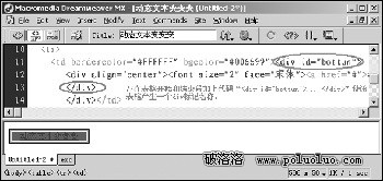 Step4:單擊工具欄“Show Design View”按鈕,顯示代碼窗口,在表格開始和結束段加代碼“〈div id="bottun"〉... 〈/div〉”使表格產生一個Div標記名稱(圖2)。