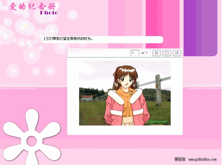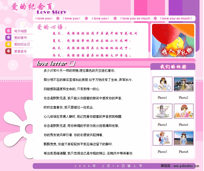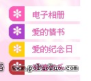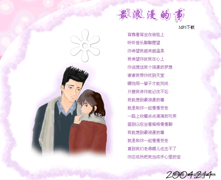 除此之外我們還將“愛的音樂”(圖2)和“電子相冊”(圖3)兩個主題頁面作為范例學習制作。當你打開音樂頁面的時候可以直觀地看到歌曲的歌詞和MP3下載鏈接,同時還會響起這首“最浪漫的事”歌曲的網頁背景音樂。電子相冊制作成為Flash動畫,打開頁面後將不用動手就可以欣賞你們所有的相片了。