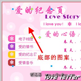 第一步當然是設計網頁的主題文字“愛的紀念頁”,將原來的Logo圖標用這個主題替換,然後把英文部分用“Love Story”來替換,文字的字體可以自行選擇,文字的顏色可以沿用模板Logo文字的顏色以便和網頁整體風格協調。在設計頁面的時候可以使用一些Fireworks自帶的特效,例如在主題文字“愛的紀念頁”底部添加一點夢幻的圖案(圖5)。