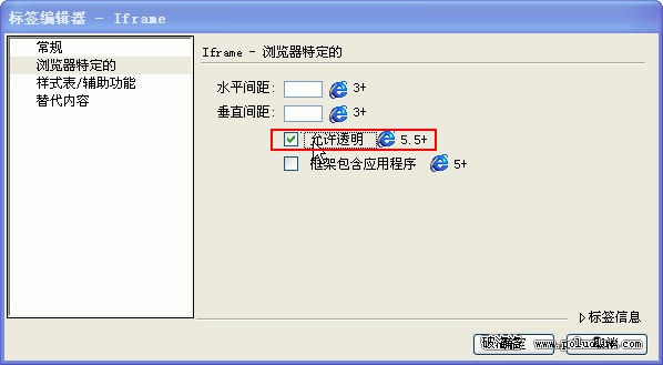在“標簽編輯器-Iframe”對話框中,選擇“浏覽器特定的”項目卡,選中“允許透明”。