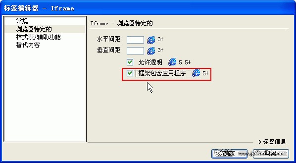 在“標簽編輯器-Iframe”對話框中,選擇“浏覽器特定的”項目卡,選中“框架包含應用程序”。
