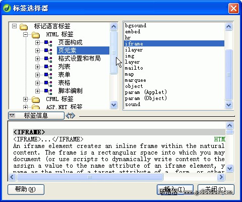 2.在“標簽選擇器”對話框中,選擇iframe標簽,點擊“插入”按鈕。