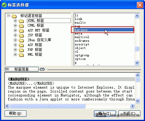3.選擇 marquee標簽,點擊“插入”按鈕。