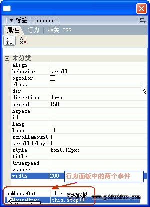 11.onMouseOver事件設置鼠標移動到滾動字幕時的動作,常設置為停止滾動。onMouseOut事件設置鼠標離開滾動字幕時的動作,常設置為開始滾動。在Dreamweaver MX 2004中需要打開“行為”面板設置。