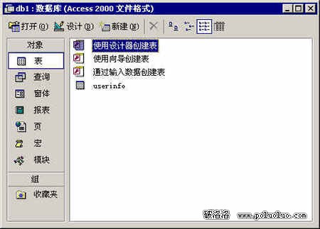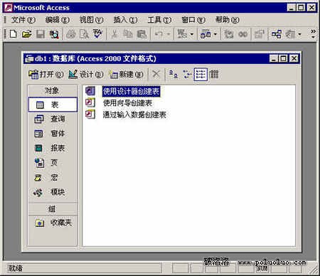 保存數據庫後我們看到的是下面的界面,雙擊使用設計器創建表,開始創建一個數據表。我們這裡的應用你只需照著步驟一步步做下去,即使你以前從沒接觸過數據庫也沒有問題,如果你想做深層次的應用,涉及到關系結構的話,那最好還是找一本數據庫的書來看看。