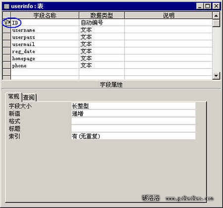 如圖,創建了一個名叫ID的主鍵(旁邊有個鑰匙圖標的),數據類型為自動編號。
