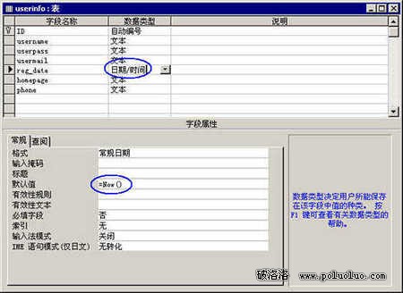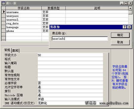 接下來我們設計一個用戶注冊用的用戶信息表。雙擊 使用設計器創建表,打開設計界面。在字段名稱一欄中填入你想紀錄的用戶信息(最好字段名不要用中文來命名,這樣以後編程的時候不會有太多麻煩,同時也要注意不要用到了數據庫自己的保留字---比如temp,這樣的話和數據庫程序會有沖突,盡量用表名+下滑線+名稱的方式來命名,比如tbl_userinfo_name,這裡我們先用簡單的命名處理)。我們共創建了6個字段,分別為username(保存用戶注冊的id)、userpass(用戶注冊用的密碼)、usermail(用戶的電子郵件地址)、reg_date(用戶注冊時間)、homepage(用戶的個人主頁地址)、phone(用戶的聯系電話)。數據類型形用它默認的文本類型,字段大小為50,先面我們再來對個別字段進行處理。