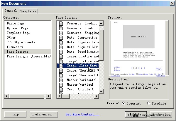 從上圖我們看到,在Category(類別)欄中列出了8個文檔類別。你可以從Basic Page(基本頁面)、Dynamic Page(動態頁面)和Frameset(框架頁面)類別中選擇一個空文檔,分別創建新的HTML頁面、動態頁面和框架頁面;從Other類別中選擇一種文檔,創建基於特定文件類型(如CSS、javascript、VBScript或Text)的頁面;從Templates Page類別中選擇一種文檔創建空的HTML模板和可以插入服務器行為的模板。CSS Style Sheets、Page Designs和Pages Designs (Accessible) 類別包含一些預建的設計文件,可以用它們來創建自己的頁面。在CSS style sheets類別中,可以選擇一種預先設計好的樣式表應用於你的文檔。