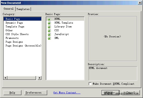 這個對話框包含兩個標簽頁:General(通用)和Templates(模板)。Templates標簽頁包含你自己定義的網站的列表(如果有的話),你可以從中選擇一個模板來創建新的文檔。General標簽頁包含各種各樣的文檔類型,你可以從中選擇一個來創建新的頁面。