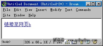 請參見前面的圖2.35,例如我們要查看網頁index.html與網頁b的鏈接關系,方法是選定網頁b,選擇Site → Open Source of Link菜單,則立即顯示鏈接關系,如圖2.36所示,文檔窗口中的超級文本是“鏈接至網頁b”,從屬性面板的link屬性可以看到“鏈接至網頁b”的鏈接目標文件是b。