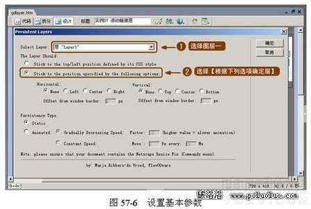 ( 5 )設置基本參數。彈出【 Persistent Layers 】對話框後,在【 Select Layer 】中選擇要應用行為的圖層 Layer1 ,然後選擇【 Stick to the position Specified by the following options 】命令,表示根據選項來確定層的位置,如圖 57-6 所示。