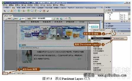 ( 4 )添加 Persistent Layers 行為。在文檔窗口的左下角單擊 <body> 標簽選中整個頁面,按 Shift + F3 鍵打開行為面板,添加 Persistent Layers 行為,如圖 57-5 所示。