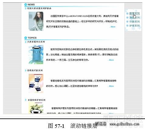 在制作網頁時,制作者經常將網頁菜單置於網頁頂端,這樣當浏覽者浏覽較長內容的網頁時,如果想選擇其他菜單,就不得不回到網頁頂端才能選擇其他菜單。本實例將學習如何制作一個滾動鏈接層,以便於浏覽者對菜單進行選擇。