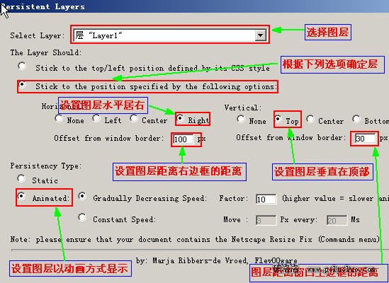 ( 5 )設置基本參數。彈出“Persistent Layers”對話框後,在“Select Layer”中選擇要應用行為的圖層 Layer1 ,然後選擇“Stick to the position Specified by the following options”命令,表示根據選項來確定層的位置。