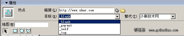 2、屬性面板改換為熱點面板如圖:鏈接輸入框:填入相應的鏈接。替代框:填入你的提示文字說明。目標框:不作選擇則默認在新浏覽器窗口打開。