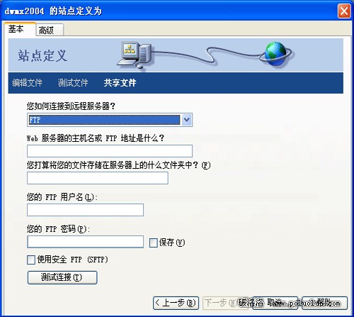 在標有“您如何連接到遠程服務器?”的彈出式菜單中,選擇“FTP”。單擊“下一步”,彈出如下對話框: