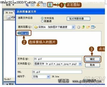 ( 2 )保存頁面並插入圖片。為了在插入圖片時不提示相對路徑,先保存頁面為“ 36.htm ”。然後插入要預載的圖片,如圖 36-2 所示。