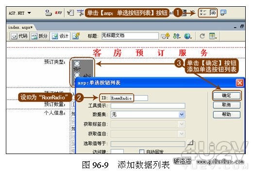 ( 4 )添加數據列表。單擊 ASP.NET 快捷菜單中的【 asp :單選按鈕列表】,操作如圖 96-9 所示。
