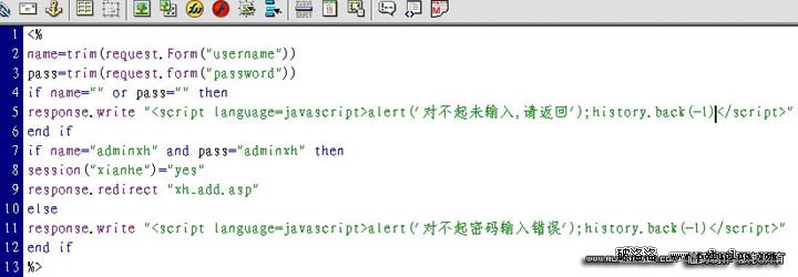 主要就是驗證輸入的用戶名和密碼是否是空值,這個參數是從登陸框傳遞過來的!記得我們給xh_login.asp的各個控件賦予了名稱