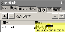 5.我們先設置激活滑動圖層的動作。選擇上展開這個按鈕,轉到行為面板,點擊在出來的菜單中選擇 [時間軸——播放時間軸] DW會彈出一個窗體,在上面的下拉菜單中選擇timeline1。