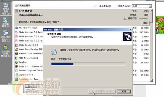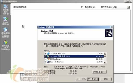 首先安裝WindowsXP下用於構建Web環境的服務程序IIS,這個程序在WindowsXP的安裝光盤裡就有。在Windows系統菜單裡選擇“控制面板->添加刪除程序->增加/刪除Windows組件”,在出現的對話框中選擇“IIS”選項,如圖1所示,點擊“下一步”完成安裝(圖2和圖3)