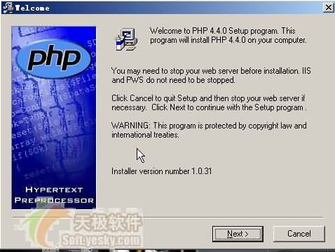 從http://www.php.net/downloads.php 上下載最新的Windows版本的PHP安裝文件php-4.4.0-installer,雙擊打開,出現圖4所示安裝界面,