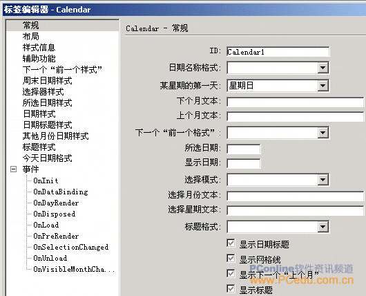 (4)按“插入”按鈕,彈出【標簽編輯器—Calendar】對話框,如圖10-3所示。在這個對話中,可以對Calendar日歷控件的樣式進行設置,由於有中文,在這裡就不多講了。