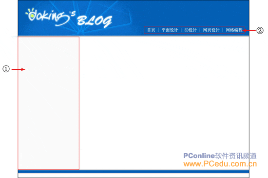 在圖4-1-1中序號①畫上紅色方圈部分的是網頁的左邊欄目,目前是空白的,它的欄目在以後章節中會一一添加上去的,序號②畫上紅色方圈部分的是網站的導航條,它是由第三章建立的dkblog.mdb數據庫中的LM表動態生成的。基本思路已清楚後,開始構建立網站的模板。