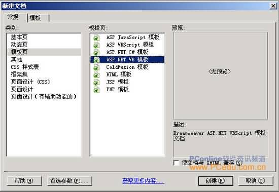 (1)打開【文件】→【新建】,打開【新文檔】的對話框,選擇“類別:”為“模板頁”,選擇“模板頁:”為“ASP.NET VB 模板”,結果如圖4-1-2所示。
