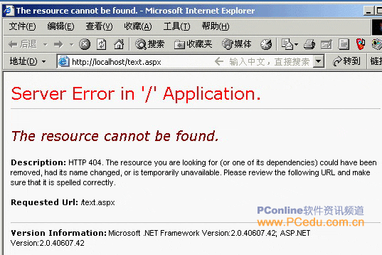 打開IE浏覽器,在地址欄上打上“localhost/text.aspx”,假定text.aspx這個文檔現在不存在,那麼IE浏覽器上一定會返回錯誤信息,如果出現如圖2-4所示的錯誤信息,說明我ASP.NET的運行環境基本構建完畢。