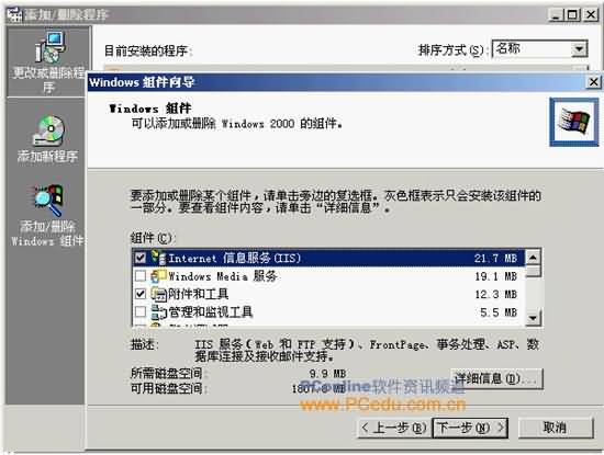 按【開始】→【控制面板】→【安裝/刪除Windows組件】,勾選“安裝Internet信息服務組件”,如圖2-1所示。