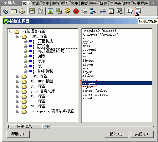 3.選擇 marquee標簽,點擊“插入”按鈕。
