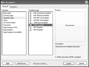 第一步:先在Dreamweaver MX 2004中運行“File→New”命令,接著從圖1所示的窗口中依次選定“Template page→HTML template”選項,點擊“Create”按鈕之後即可創建一個模板文件。