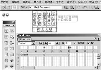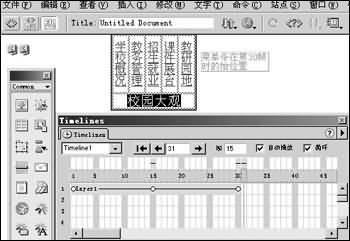 3、現在還要設置一個行為讓時間線停止後能繼續播放。我的設想是這樣的:在一般狀態下菜單條彈回但僅保留下方的“校園大觀”字樣,而菜單條再次彈出和彈回則由鼠標是否經過了菜單條上的“校園大觀”來控制。如此可以這樣繼續進行:選定菜單條中的“校園大觀”(要確保該字樣的超鏈接地址為“#”,即空鏈接)字樣,單擊行為面板中的“+”按鈕,在彈出的菜單中選擇“Timeline/Play Timeline”,在接著彈出的對話框中選擇“Timeline1”後單擊確定按鈕,這時行為面板中將增加一個行為,在其“Events”下拉列表中選擇“onMouseOver”事件,表示當鼠標處於該字樣上方時播放動畫(如圖4)。