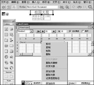 1、選定層面,當鼠標變成“十”字形時按住左鍵將層面拖動到頁面右上角(使整個菜單條完全露出但上邊緣正好靠攏頁面上邊界),在窗口菜單中打開時間線面板,選定層面將其拖動到時間線上,Dreamweaer會自動產生一個長度為15幀的動畫對象,拖動該動畫對象的最後一個關鍵幀到第30幀,將其長度設置為30幀。然後在第15幀處單擊右鍵,在彈出的快捷菜單中選擇“添加關鍵幀”選項插入一個關鍵幀,並將層面拖動到適當位置(如圖2)。