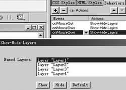 接下來,打開“Behaviors”面板,同時選中“產品中心”鏈接(注意,這個時候不能夠選中剛剛建好的層,否則無法應用“Show-Hide Layers”行為),單擊“+”號,選擇“Show-Hide Layers”,就可以看到我們剛剛建好的層在選擇項中,可以設定為隱藏或者顯示(如圖2)。