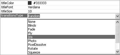 現在我們可以對各選項進行一下設置。需要注意的是imageCaptions、imageLinks以及imageURLs處的各項之間需用逗號分開,並將你的圖片地址以及點擊後的鏈接地址填入相應框內,對於色彩的設置以及其它處理大家可根據自己需要來設置,同時對於最後一項圖片間的轉換效果,大家可以根據自己的喜好來選擇,類似制作Power Point中幻燈片間的切換效果(圖4)。