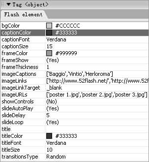 從上到下的各種屬性依次為:圖片播放界面背景色、圖片標題色彩、圖片標題字體、圖片標題字體大小、動畫框架色彩、是否顯示框架、框架厚度、圖片標題、圖片鏈接地址、窗口打開方式、圖片地址、是否顯示控制條、是否自動播放、圖片間隔延時、是否循環播放、標題、標題色彩、標題字體、標題字體尺寸以及轉變類型。