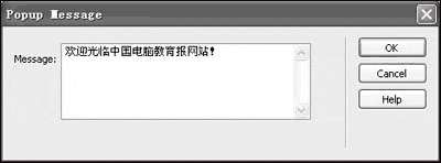 第二步 在行為面板中點擊“+”按鈕,並且從彈出菜單中選取“Popup Message”命令,這時可以看見圖1所示的窗口,在其中可以輸入諸如“歡迎光臨中國電腦教育報網站!”之類的提示信息。