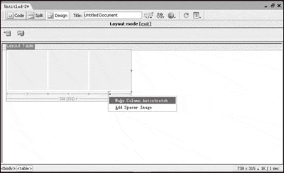 第二步 這時可以看見每個單元格下部都標明了寬度且有一個小三角形(如圖3)。在這個表格中,可以設定哪部分是需要固定的,不過只能讓一列自動伸展,比如此處我們設定最後一列隨著窗口大小的變化自動伸展。