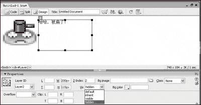第二步 通過“Insert→Layer Objects→Layer”命令在圖像旁邊添加一個層,並且輸入需要顯示的話。選擇這個層之後,在屬性面板中將“Vis”屬性設置為“hiddend”來隱藏該層(如圖2)。
