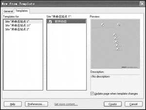有了模板之後,接下來就要在編輯網頁時候使用它們了。只要在Dreamweaver MX 2004主窗口中運行“File→New”命令即可看見圖1所示的新建窗口,接著進入“Templates”標簽即可查看到已經保存的模板,從中選取一種還可以在右部的預覽區進行預覽(圖3),最後挑選一款中意的模板並點擊下部“Create”按鈕打開這個模板。