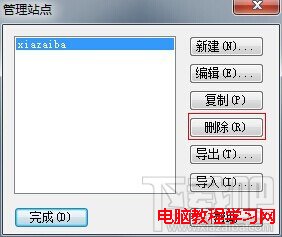 在彈出的對話框中選中要刪除的站點,如“xiazaiba”,然後單擊右側的刪除按鈕,即可完成刪除站點操作。