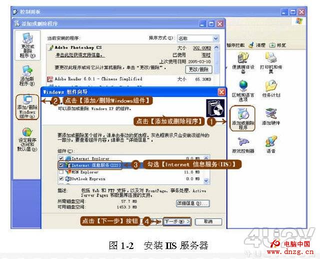 ( 2 )在彈出的【控制面板】窗口中雙擊【添加或刪除程序】按鈕圖標,在彈出的【添加或刪除程序】對話框中選擇安裝 IIS 服務器,如圖 1-2 所示。