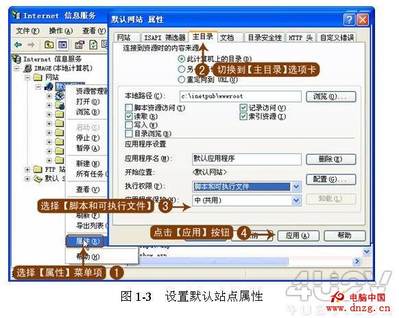 ( 3 )安裝好 IIS 服務器後,在【控制面板】窗口中單擊管理工具,然後在彈出的【管理工具】窗口中單擊【 Internet 信息服務】,進行默認站點屬性的設置,具體操作如圖 1-3 所示。