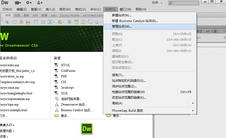2、點擊菜單中的“站點”,選擇“管理站點”。