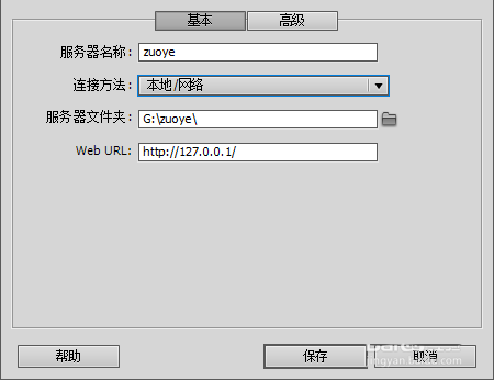 5、然後輸入服務器名稱、連接方法選擇為“本地/網絡”、選擇網站所在文件夾、WebURL輸入http://127.0.0.1/,然後點擊保存。