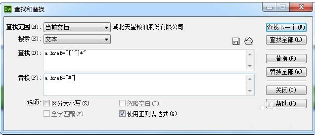 3、在查找和替換窗口中勾選“使用正則表達式”,然後在查找欄中輸入:a href="[^"]*",在替換欄中輸入:a href="#"。這裡的#可以是你需要的網址。然後點擊“替換全部”按鈕就OK了!